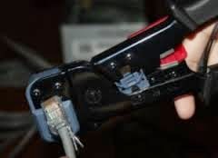 - Masukkan konektor yang sudah terpasang kabel ke alat crimping tool untuk dilakukan penguncian kabel (pastikan alat crimping tool masih bagus agar kualitas penguncian lebih bagus