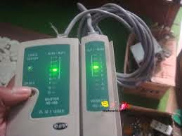- Setelah pemasangan kedua ujung kabel selesai, lakukan pengujian dengan kabel tester. Jika lampu-lampu kabel tester menyala sesuai dengan pola hubungan kabel berarti pemasangan sudah selesai